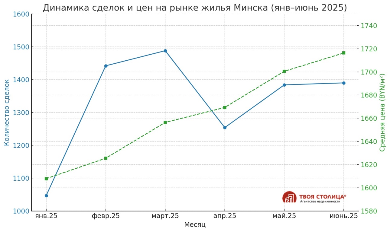 В июне рынок вторичного жилья Минска закрепил тренд на стабильность. Объём сделок уверенно держится в диапазоне 1350–1400 в месяц — именно столько квартир было продано в прошлом месяце. При этом доля готовых новостроек от застройщиков снизилась до 7%. Складывается ощущение, что первичный рынок, ранее активно разогревавший цены, теряет часть спроса, уступая позицию более доступному и разнообразному вторичному фонду.