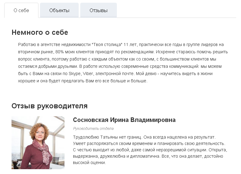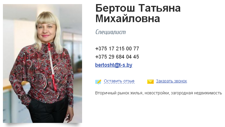 Новый раздел на сайте www.t-s.by с одноименным названием – «Наши специалисты» - поможет найти по-настоящему «своего» человека среди команды профессионалов «ТВОЯ СТОЛИЦА•АГЕНТСТВО НЕДВИЖИМОСТИ». Подумайте, что для Вас действительно важно: большой опыт работы в сфере недвижимости и образование, жизненные принципы и отзывы руководителя и клиентов? Знакомьтесь заочно, изучайте карточки сотрудников, определяйтесь с выбором – мы открыты для продуктивного сотрудничества!