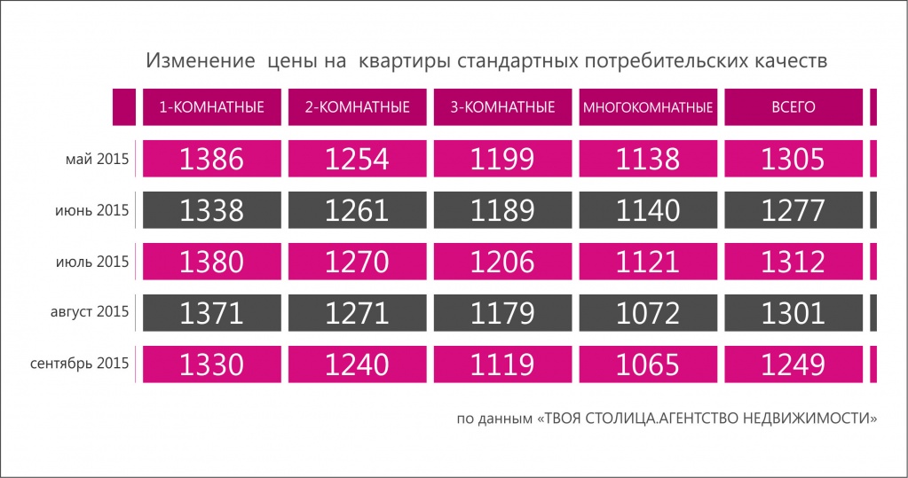 Что касается аналитических данных, то эксперты констатируют значительную активность продаж по эконом - и стандарт - сегментам. Стоимость квадратного метра в квартирах стандартных потребительских качеств скорректировалась с мая по сентябрь 2015 в сторону снижения в среднем на 4.1 %. По итогам сентября цена однокомнатных квартир составила в эквиваленте 1330 у.е. за квадратный метр, двухкомнатных- в районе 1240 у.е. за квадратный метр, а трехкомнатные продавались по цене 1119 у.е. за квадратный метр.