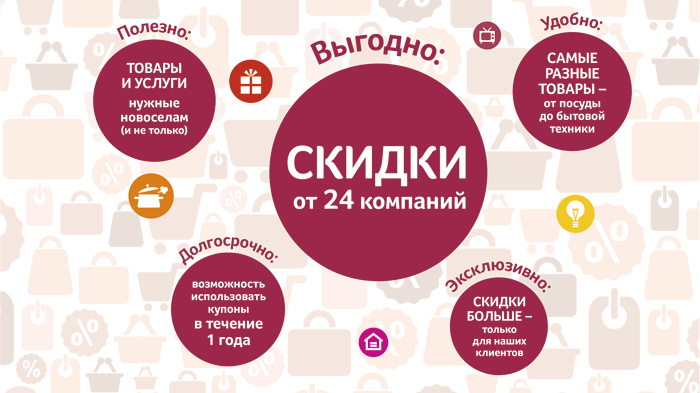 - 24 компании–партнера, товары и услуги которых интересны новоселам. Среди них компании по производству мебели и уборке помещений, магазины, торгующие сантехникой, бытовыми приборами и строительными материалами, салоны светильников и штор, строительная компания и компании по монтажу полов, потолков и прочее