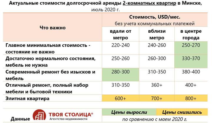 Двухкомнатные квартиры востребованы в основном семейными парами различного возраста, в том числе и с несколькими детьми. Для многих из них арендовать более просторную трехкомнатную квартиру необоснованно дорого — как по стоимости аренды, так и по стоимости коммунальных платежей, которые по сложившейся практике ложатся на арендатора. В среднем же стоимость двухкомнатной квартиры стандартных потребительских качеств сейчас варьируется в пределах 250−300 долларов в месяц.