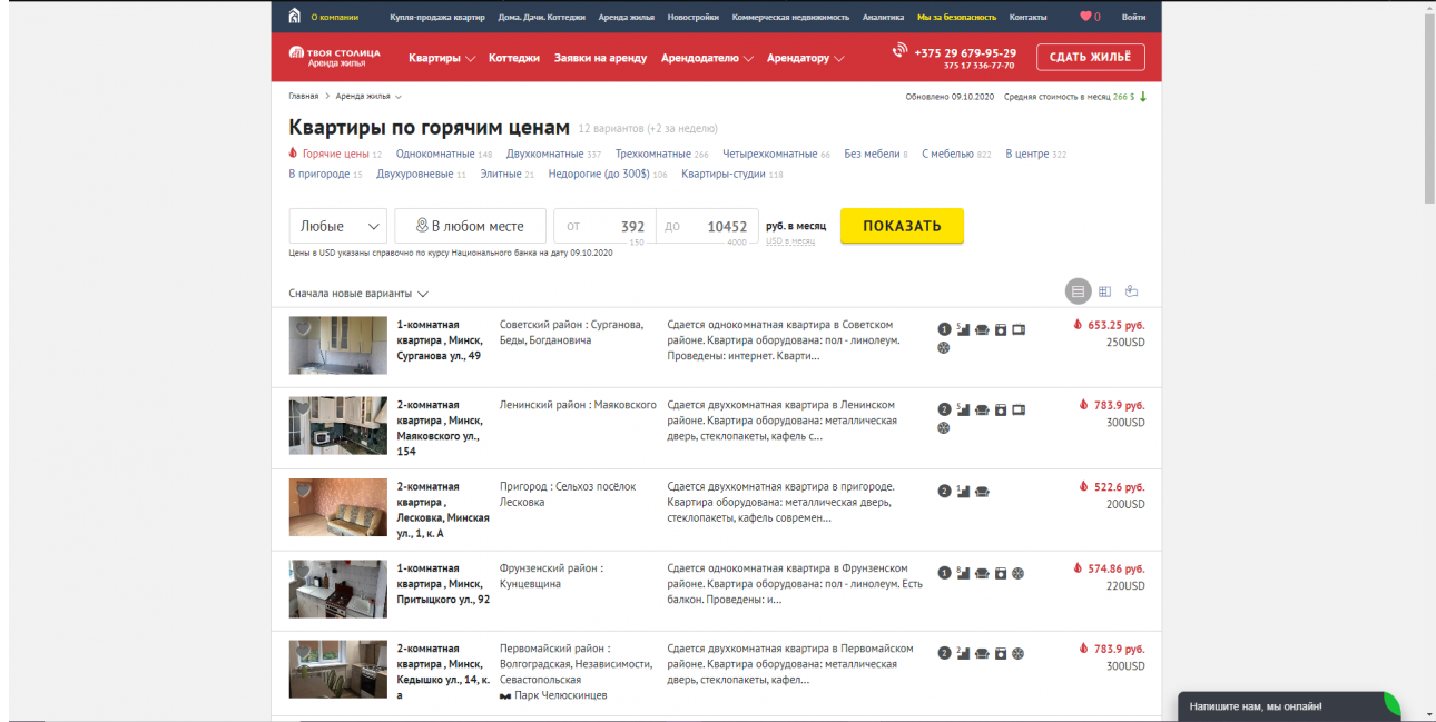 Страница «Горячие цены» – хорошее решение для арендаторов, ведь там опубликованы лучшие предложения от собственников. В одном разделе мы собрали для Вас все самые «горячие» предложения: квартиры из наиболее популярных районов с очень привлекательными ценами, можно даже сказать, по низким ценам, – комментирует Надежда Вашинко, начальник отдела аренды жилья «ТВОЯ СТОЛИЦА∙АГЕНТСТВО НЕДВИЖИМОСТИ». – Например, недавно к нам попала трёхкомнатная квартира с хорошим ремонтом за 270$. Почему так? Собственник хотел поскорее сдать квартиру, чтобы избежать убытков из-за простоя. Это не единичный случай, к нам часто обращаются собственники жилья, которые понимают ситуацию рынка либо прислушиваются к специалистам и устанавливаю конкурентные цены.