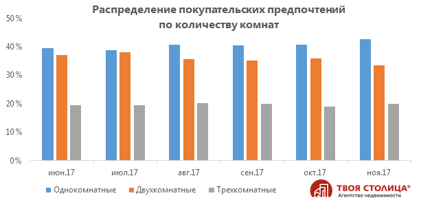 По итогам заключенных ноябрьских сделок можно сказать, что наиболее активно раскупаются недорогие однокомнатные и двухкомнатные квартиры. В этом нет ничего необычного, однако, за последние 6 месяцев, структура спроса очевидно изменяется. Доля приобретенных однокомнатных квартир растет, в то время как доля двухкомнатных снижается.