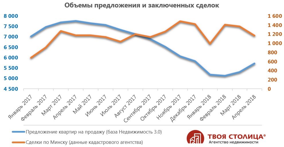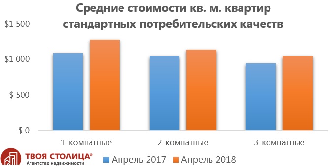 Что касается квартир вторичного рынка, то за январь-апрель текущего года квартиры стандартных потребительских качеств подорожали в среднем на 9% или порядка +100 USD на 1 квадратный метр. То есть за текущую стоимость квартиры, в конце 2017 г. можно было не только купить квартиру, но еще и сделать в ней косметический ремонт. А если сравнить текущий уровень цен с аналогичным периодом прошлого года, то дельта вырастает до 13% или порядка +130 USD/кв. м.