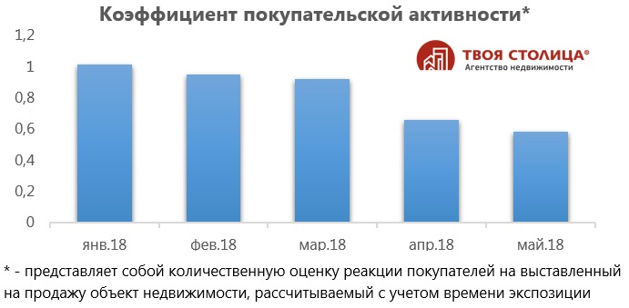 Кроме того, на цены давит снижение спроса. В подтверждение своего мнения эксперт «Твоей столицы» приводит коэффициент покупательской активности, который по итогам мая опустился до уровня кризисного ноября 2016 г.
