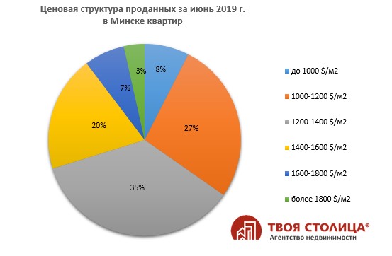 Если рассматривать сделки июня более детально, то 27% квартир в городе было проданы в диапазоне цен от 1 000 USD до 1 200 USD/кв. м, 35% - от 1 200 USD до 1 400 USD/кв. м, и лишь 20% - от 1 400 USD до 1600 USD/кв. м. И это самые значимые по количеству сделок диапазоны цен для квартир в разных домах, районах и с разным качеством отделки.