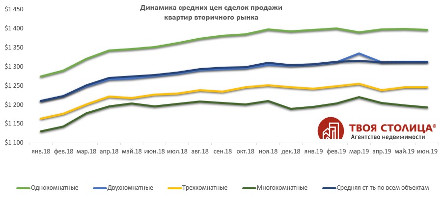 Наглядный пример, по результатам заключенных в городе сделок, средняя цена квадратного метра составила в июне порядка 1 300 USD/кв.м. А в разрезе количества комнат, уже видны существенные средне-ценовые различия.