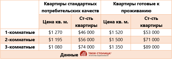 Готовые к проживанию квартиры – это квартиры с хорошим, достаточно свежим ремонтом, и, частично, мебелью. С квартирами этого класса качества в этом году заключается порядка 35-40% от всего объема сделок. Ремонт в таком жилье выполнен с использованием современных материалов и включает в себя качественные окна, межкомнатные двери, плитку и напольные покрытия. Из мебели, как правило, остается встроенная кухня с техникой и встроенные системы хранения (шкафы-купе либо гардеробная). Привлекательность этих квартир заключается в том, что благодаря наличию хорошего и при этом сделанного совсем недавно ремонта, будущий собственник может спокойно заезжать в квартиру и не думать об обновлении внешности квартиры еще долгое время. Диапазон цен на квартиры с качественным ремонтом - от 1 200 USD до 1 700 USD/кв.м