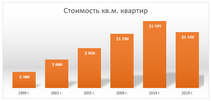 Сейчас усредненная стоимость квадратного метра составляет порядка 1330 $/кв.м. Приблизительно за ту же цену потенциальный покупатель мог бы приобрести квартиры осенью 2009 и 2010 годов. А вот в 2014 году жилье стоило на 25% дороже. Интересно, что средняя зарплата в Минске осенью 2014 и летом 2019 г была сопоставима - составляла 780 $ и 740 $ соответственно.