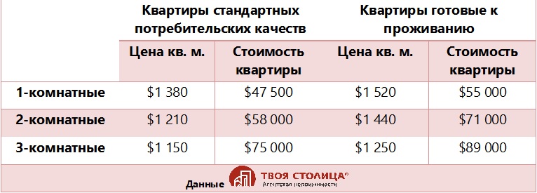 Если же говорить о средних ценах сложившимся по итогам декабря в разбивке – квартира стандартных потребительских качеств (обычная квартира, которую стоит отремонтировать) и готовая к проживанию (“въезжай и живи”), то, по данным «ТВОЯ СТОЛИЦА ∙ АГЕНТСТВО НЕДВИЖИМОСТИ»: