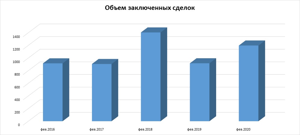 Уровень спроса в феврале был выше среднего – на вторичном рынке заключено порядка 1200 сделок, 6% из них – квартиры от застройщика в готовых новостройках. За последние пять лет в феврале более активно квартиры приобретались только в 2018 г.