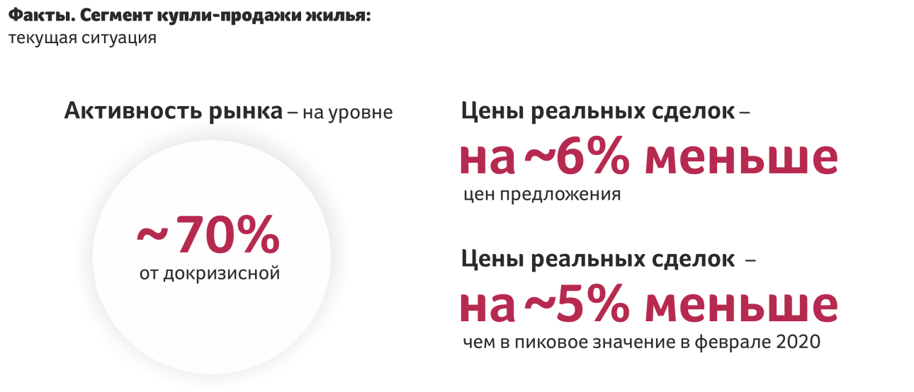 В целом, индикаторы, очередность изменений показателей, механизм развития кризиса на рынке всегда похожи. Если сравнивать текущую ситуацию с предыдущими спадами, то наиболее корректно сравнение с 2008 годом. Кризисы 2011 и 2014 были локальными, сейчас же в рецессию входит мировая экономика. Механизм следующий: первый шок и резкое снижения покупательской активности, которое приводит к изменению в объеме совершенных сделок (что констатирует НКА месяцем-двумя позже), снижение цен реальных сделок, и «догоняющее» снижение цен предложения. Итоговые показатели «опаздывают» от рынка на колоссальные для кризисного времени несколько недель. Ориентиром должен служить уровень заявленного спроса и цены т.н. «предварительных» договоров.