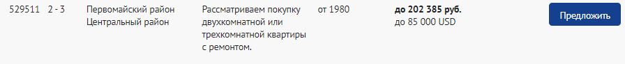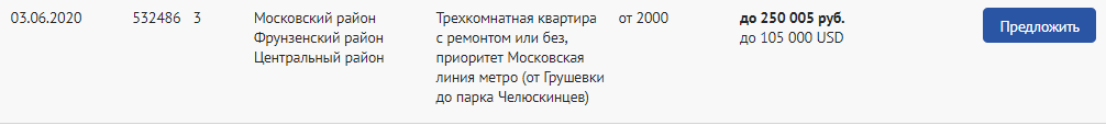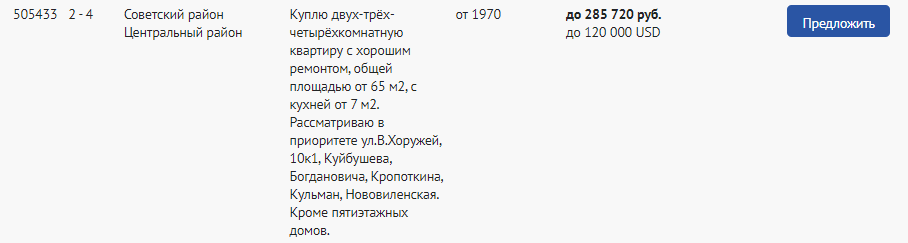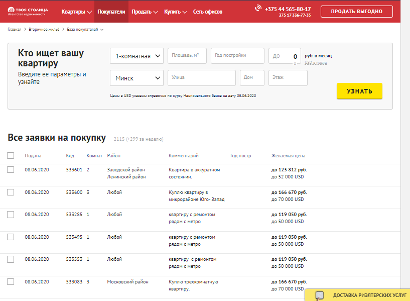 Сейчас любой продавец недвижимости может зайти на страницу базы и оценить спрос на свои квадратные метры. Удобный фильтр позволяет указать количество комнат, площадь, год постройки, материал стен, желаемую цену и прочее. Собственник получит пул реальных заявок и может сразу же предложить свою квартиру потенциальным покупателям.