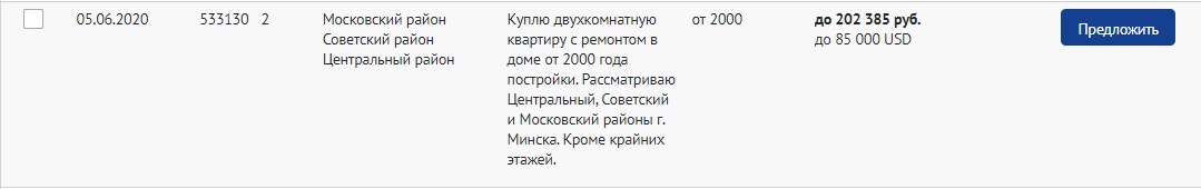 Мы публикуем актуальные запросы на покупку недвижимости от реальных клиентов в момент поступления. Запросы покупателей могут быть как универсальными, например, трехкомнатная квартира в определенном ценовом диапазоне в любом районе Минска, так и индивидуальными, когда клиенту необходима покупка квартиры в конкретном доме.
