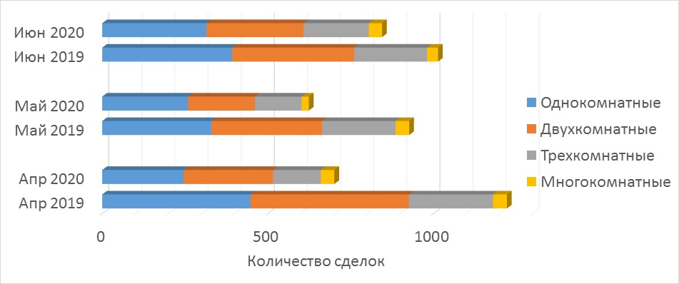 В целом, в первом полугодии 2020 года заключено на 7% меньше сделок, чем в аналогичный период прошлого года. И если февраль и март были достаточно продуктивными, то апрель, май и июнь по количеству сделок провалились.