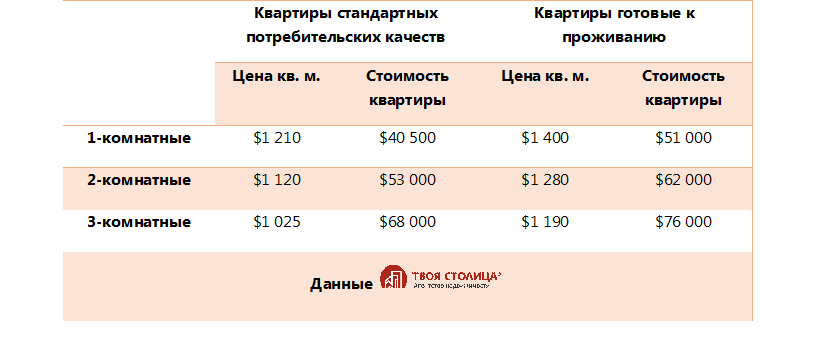 Если же говорить о сформировавшихся на рынке средних ценах, в разбивке – квартира стандартных потребительских качеств (обычная квартира, которую стоит отремонтировать) и готовая к проживанию (“въезжай и живи”), то, по данным «ТВОЯ СТОЛИЦА ∙ Агентство недвижимости», в начале октября: