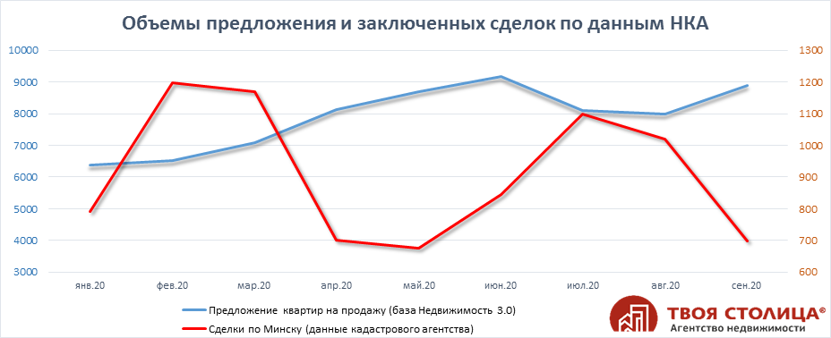 Кроме того, на рынке сформировался тренд на снижение стоимости приобретенного жилья. Так, по итогам заключенных за сентябрь сделок, средняя цена квадратного метра снизилась на 2%. В отсутствие кредитов интерес покупателей начал смещаться в сторону недорогого и компактного жилья. В результате, в реальных сделках прослеживается “проседание” стоимости квартиры на 5-6 тыс USD.