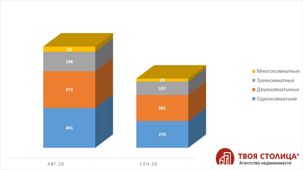 В октябре по-прежнему наиболее популярны были недорогие однокомнатные и двухкомнатные квартиры. Впрочем, на фоне общего снижения спроса, в октябре снизилась доля однокомнатных квартир. Теряют привлекательность однокомнатные квартиры с завышенной стоимостью. Очевидно, что покупатели скорее предпочтут купить дешевую малогабаритную двух-трехкомнатную квартиру, чем дорогую «однушку» по аналогичной цене.