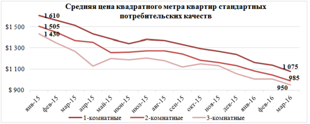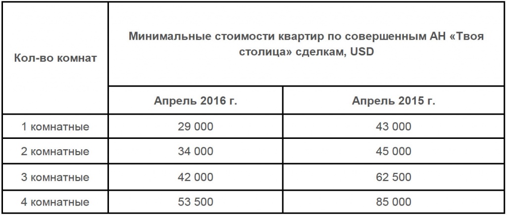 По данным отдела консалтинга и аналитики «Твоя столица ∙ Управление проектами», в апреле средняя цена кв. м. квартир стандартных потребительских качеств по итогам заключенных сделок сформировалась на уровне 1 070 USD/кв. м для однокомнатных, 1 005 USD/кв. м. для двухкомнатных и 910 USD/кв. м для трехкомнатных квартир. А всего с начала 2016 года, цены снизились на 13% или на 140 USD/кв. м.