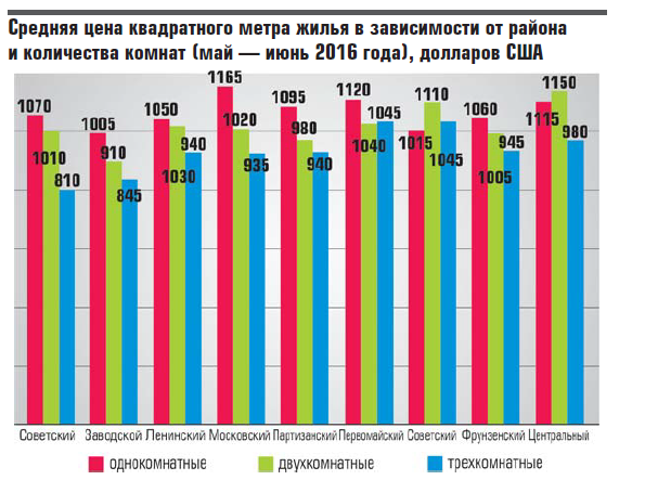 По данным «Твоей столицы», сейчас средняя цена сделки с однокомнатными квартирами стандартных потребительских качеств находится на уровне 33—36 тыс. долларов (1060 долларов/кв. м), с двухкомнатными — 45—50 тыс. долларов (1000 долларов/кв. м), с трехкомнатными — 57—62 тыс. долларов (940 долларов/кв.м).