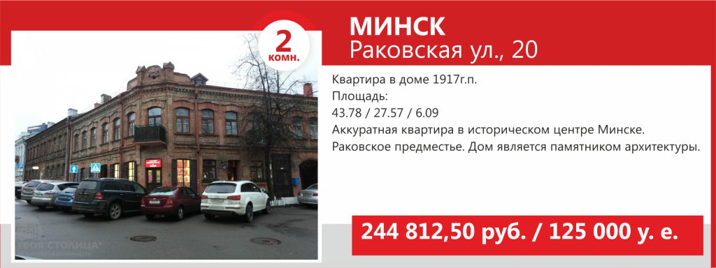 А за 125 000 у.е можно приобрести двухкомнатную квартиру в уникальном доме в самом сердце Минска- по адресу Раковская, 20: