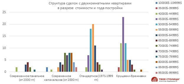 Средняя цена двухкомнатных квартир - 50-55 тыс. USD. Как правило, это будут квартиры в стандартных домах 1971-1999 г.п. Но стоит отметить, что на рынке можно найти квартиру и на 5 тыс. USD дешевле указанного диапазона, но опять же – требующую проведения существенного ремонта.