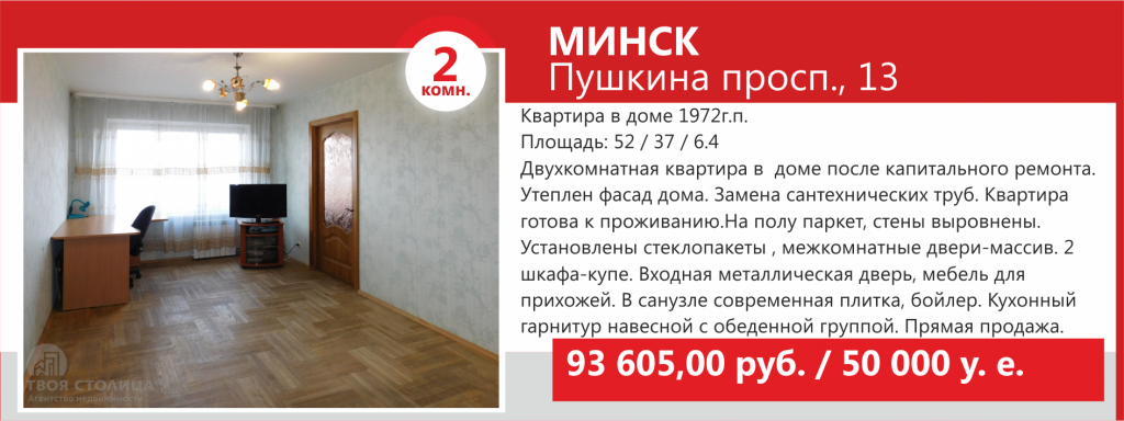 «ТВОЯ СТОЛИЦА. АГЕНТСТВО НЕДВИЖИМОСТИ» приглашает на бесплатные консультации по всем вопросам, касающимся купли-продажи жилой недвижимости 4-7 апреля с 10.00 до 20.00 и 8 апреля с 10.00 до 17.00. ДНИ ОТКРЫТЫХ ДВЕРЕЙ пройдут в отделении «МЕТРО ПУШКИНСКАЯ» по адресу: г. Минск, Притыцкого, 17.