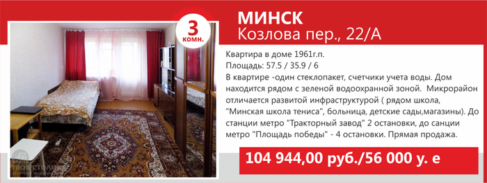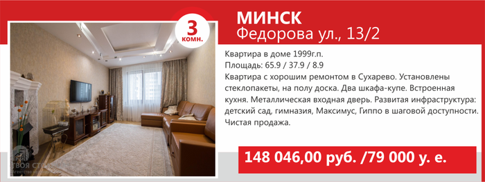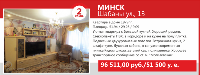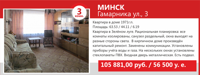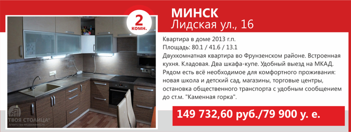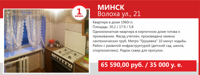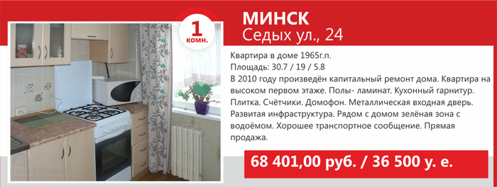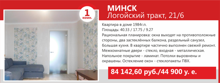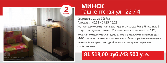 «Интерес таких покупателей с начала 2017 года уверенно смещается с «однушек» в сторону двухкомнатных квартир. За январь – апрель из всего объема сделок купли-продажи с участием жителей регионов больше половины прошли с участием «двушек», ― продолжают в «ТВОЯ СТОЛИЦА∙АГЕНТСТВО НЕДВИЖИМОСТИ». ― Одно- и трехкомнатные квартиры приобретаются реже и приблизительно в одинаковых пропорциях. В качестве альтернативного варианта покупатели из регионов рассматривают дома в Минске и ближнем пригороде».