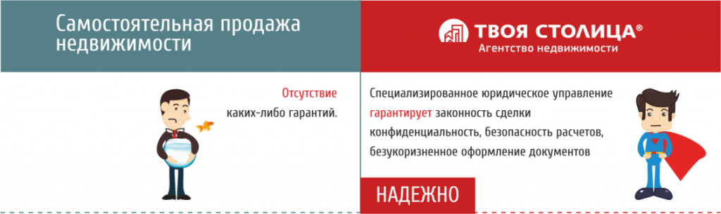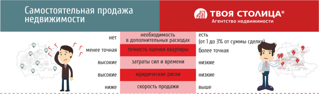 Сэкономить деньги и пойти на риск или довериться специалистам агентства недвижимости — решение за участниками сделки. Практика показывает, что обращение в агентство - оптимальный выбор. Если вам необходимо продать свою недвижимость, получите квалифицированную помощь в сети офисов «ТВОЯ СТОЛИЦА·АГЕНТСТВО НЕДВИЖИМОСТИ».
