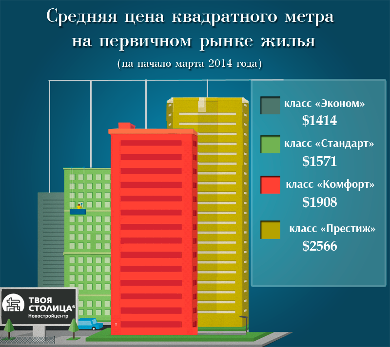 Отдел «ТВОЯ СТОЛИЦА.НОВОСТРОЙЦЕНТР» решил наглядно продемонстрировать среднюю стоимость квадратного метра на первичном рынке жилья классов «Эконом», «Стандарт», «Комфорт», «Престиж» на начало марта 2014 года.