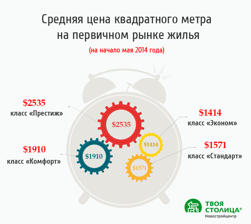 На начало мая 2014 года средняя цена квадратного метра на первичном рынке жилья класса «Эконом» и «Стандарт» составила $1414 и $1571 соответственно, класса «Комфорт» и «Престиж» - $1910 и $2535 соответственно.