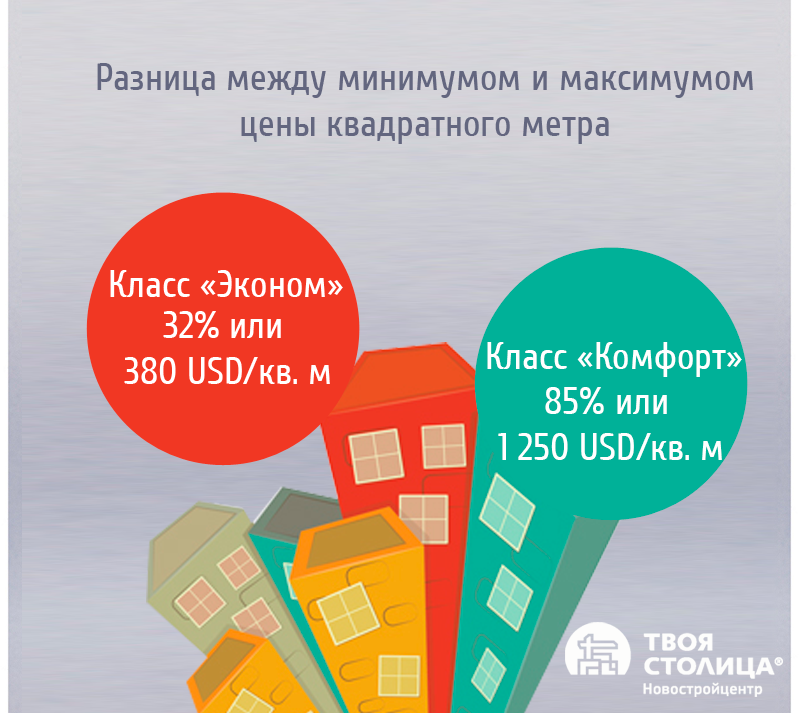 По данным ТВОЯ СТОЛИЦА.НОВОСТРОЙЦЕНТР, на первичном рынке жилья Минска разница между минимумом и максимумом цены квадратного метра в классе "Эконом" составляет 32% или 380 долларов, а для домов класса «Комфорт» - 85% или 1 250 USD.