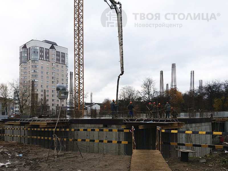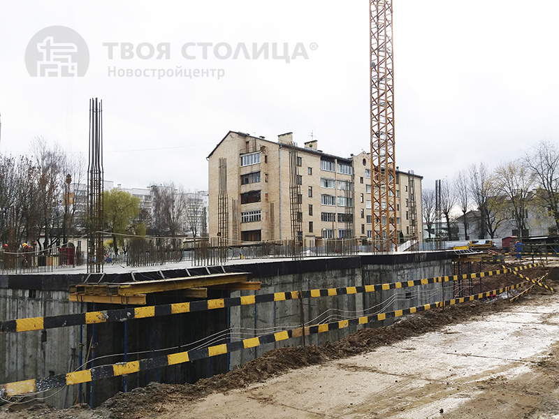 Работы на строительной площадке ведутся строго в соответствии с утвержденным графиком строительства. На сегодняшний день залит фундамент цокольного этажа и проведены работы по гидроизоляции фундамента, а также выполнен железобетонный каркас первого этажа. Завершение строительства запланировано на 4 квартал 2018 года.