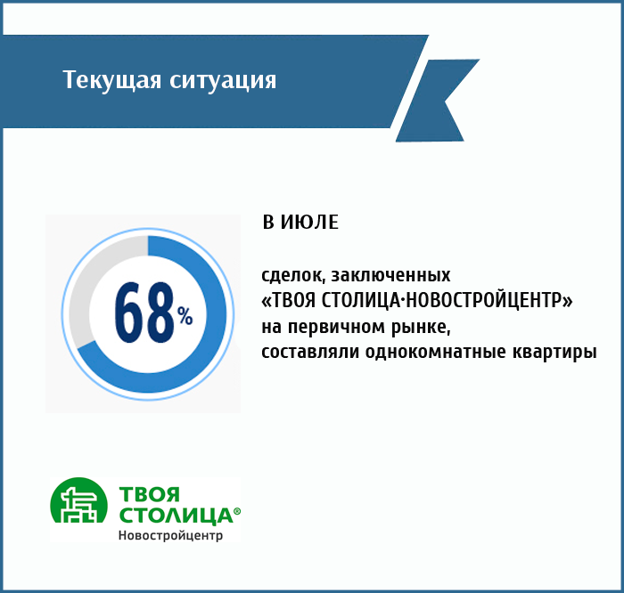 В июле 68% сделок, заключенных «ТВОЯ СТОЛИЦА.НОВОСТРОЙЦЕНТР» на первичном рынке, составляли однокомнатные квартиры.