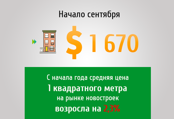 По данным «ТВОЯ СТОЛИЦА.НОВОСТРОЙЦЕНТР», с начала года средняя цена 1 квадратного на рынке новостроек возросла на 2,3% и на начало сентября составляет 1 670 $. По сравнению с августом текущего года средний уровень цен вырос на 0,7%.