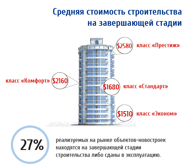 По данным «ТВОЯ СТОЛИЦА.НОВОСТРОЙЦЕНТР», порядка 27% реализуемых на рынке объектов-новостроек находятся на завершающей стадии строительства либо сданы в эксплуатацию. Средняя стоимость строительства на данной стадии для объектов класса «Эконом» и «Стандарт» составляет $1510 и $1680, класса «Комфорт» и «Престиж» - $2160 и $2580.
