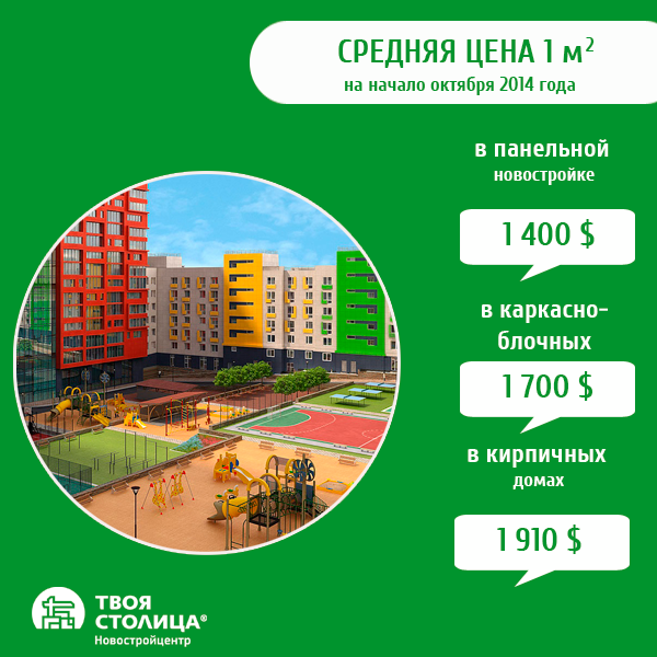 По данным «ТВОЯ СТОЛИЦА.НОВОСТРОЙЦЕНТР»,на начало октября 2014 года средняя цена 1 кв. м в панельной новостройке составляет 1 400 $. В то время как в каркасно-блочных и кирпичных домах цены значительно выше - 1 700 $ и 1 910 $ соответственно.