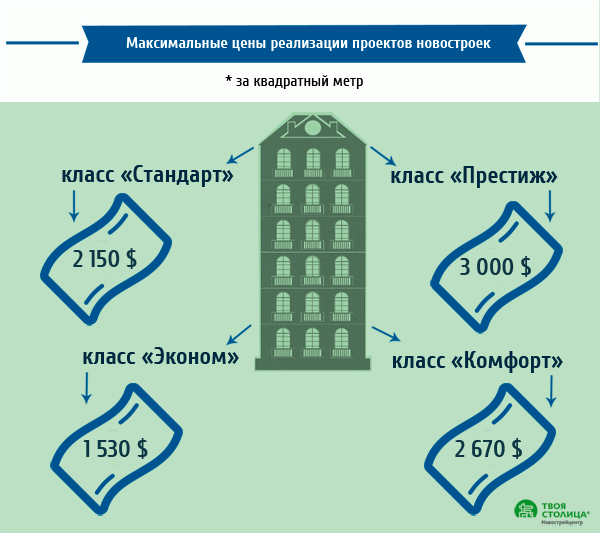По данным отдела «ТВОЯ СТОЛИЦА.НОВОСТРОЙЦЕНТР», максимальные цены реализации проектов новостроек составили для классов «Эконом» и «Стандарт» 1 530 $ и 2 150 $, для классов «Комфорт» и «Престиж» - 2 670 $ и 3 000 $ за квадратный метр.