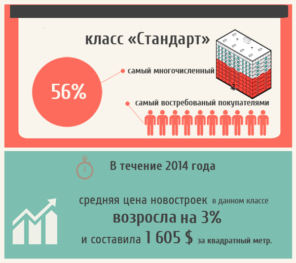 «Индикатором» цен на рынке новостроек выступает класс «Стандарт» как самый многочисленный (56% предложения) и востребованный покупателями. По данным отдела «ТВОЯ СТОЛИЦА.НОВОСТРОЙЦЕНТР», средняя цена новостроек в данном классе в течение 2014 года возросла почти на 3% и на начало декабря составила 1 605 $ за квадратный метр.