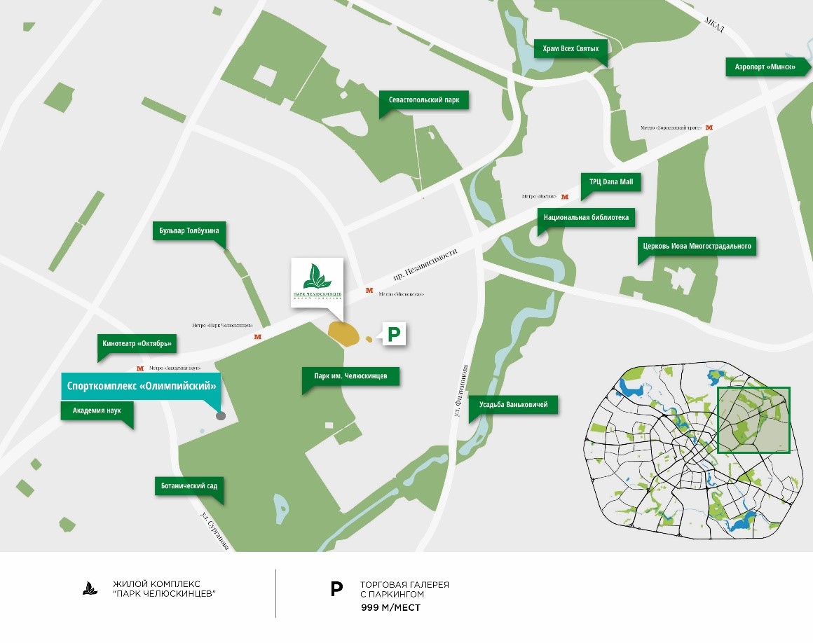 Комплекс располагается на пересечении проспекта Независимости и улицы Макаенка. В пешей доступности – остановки наземного транспорта и две станции метро – «Парк Челюскинцев» и «Московская».