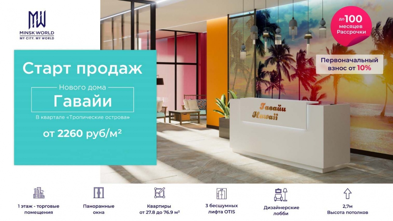 Гавайи – настоящий рай на земле, побывать в котором хотя бы раз хочется всем. Но одно дело – попасть в тропическую сказку на несколько дней и совсем другое – переехать сюда жить! В многофункциональном комплексе Minsk World у клиентов есть такая возможность. Сегодня стартуют продажи в доме «Гавайи» квартала «Тропические острова».