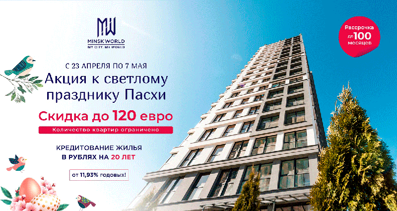 С 23 апреля по 7 мая действует пасхальная АКЦИЯ! Купить квартиру в Minsk World можно со скидкой до 120 евро за квадратный метр! Акция действует как при 100%-ной оплате, так и в случае применения рассрочки. Количество квартир ограничено!