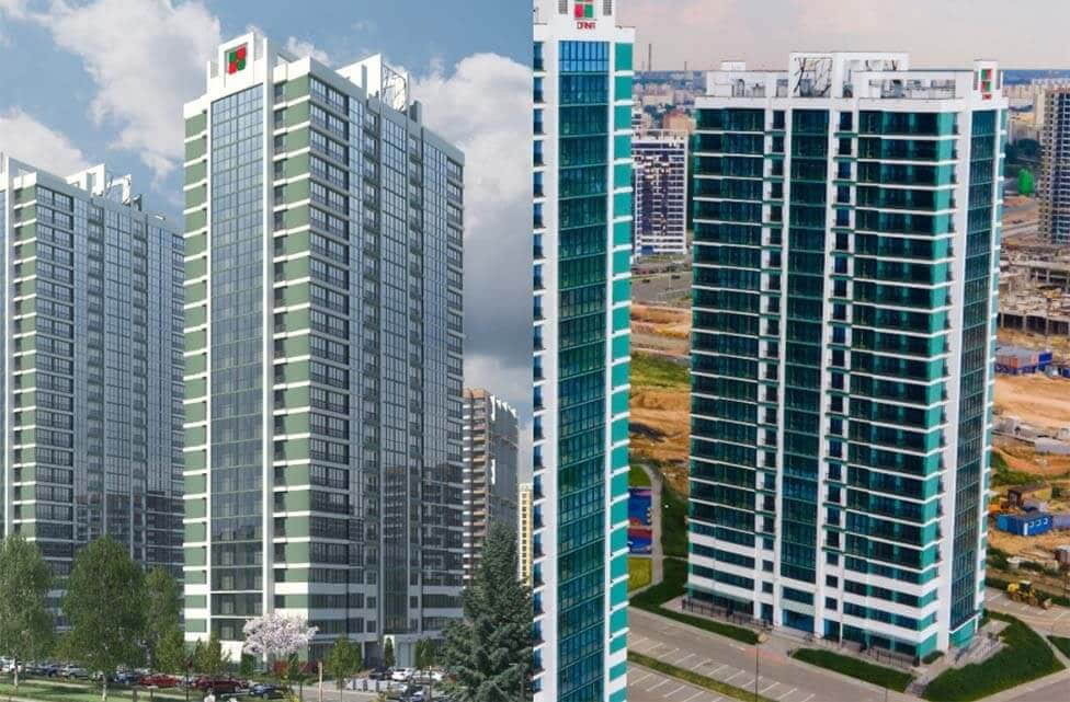 Дом «Варшава» на рендерах (слева) и в готовом виде (справа)