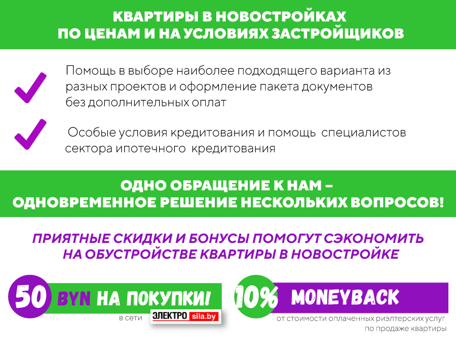 - Понятно, что это далеко не все вопросы, которые обязательны в принятии решения к покупке квартиры в новостройке. У каждого своя ситуация. Кому-то необходимо сначала продать квартиру, а потом купить в новостройке, а значит нужно четко знать, сколько времени выбранный вариант может быть на брони. К слову, решение о покупке жилья в том или ином проекте приходит не быстро. Средний срок актуальности заявки покупателя на приобретение новостройки не меньше месяца, а то и больше. Многие обращаются к нам не раз, и не два, прежде, чем все-таки определяются с выбором. Когда запрос на подборы квартиры в новостройке приходит в «Твою столицу», клиент получает срез по подходящим ему вариантам. Мы рассказываем и про качественные характеристики жилых комплексов, и про особенности рассрочки и кредита. Сами обращаем внимание клиента на нюансы, о которых он может не знать. Такой детальный анализ уже на первой консультации избавляет от долгих переговоров и самостоятельного сбора информации. Для удобства покупателя практически на любой запрос у наших специалистов есть отработанный механизм. К примеру, для тех, кому нужен кредит, работает специалист по ипотечному кредитованию. Он делает расчеты максимально возможной суммы и ежемесячных платежей, которую можно получить у банков-партнеров, помогает в оформлении пакета документов. Все ошибки в справках исправляются до подачи в банк, что очень удобно. При необходимости продажи своего жилья для покупки новостройки взамен, специалисты нашей компании сопровождают обе сделки одновременно. В этом случае клиент получает еще один бонус: длительную бронь выбранной квартиры в новостройке на время продажи своей. В этом случае дополнительно к бесплатному подбору вариантов (а это не одна консультация, помощь в оформлении документов, показы готовых квартир и другое) наши покупатели получают еще и манибэк 10% от стоимости риэлтерских услуг по продаже квартиры, а также дисконтную карту в «ОМА». В октябре появится еще один бонус: все, кто выберет приобретет квартиру в любом из проектов ОДО «Айрон», получит сертификат на 50 BYN на покупки в магазинах торговой сети «Электросила» и на первый взгляд, суммы небольшие, но при затратах на приобретение жилья, в котором нужно еще делать ремонт, любая экономия лишней не будет.
