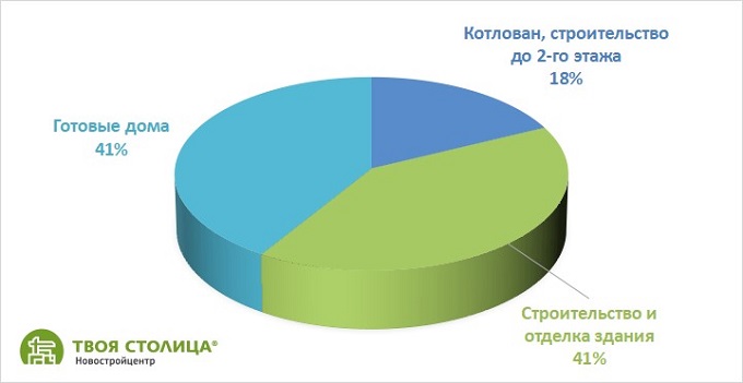 В настоящее время на начальных стадиях строительства в Минске предлагается 18% новостроек. 41% - это активно строящиеся дома, аналогичный объем приходится на сданные в эксплуатацию новостройки. Как правило, в готовых новостройках продаются остатки квартир и уровень цен на них выше среднерыночного.