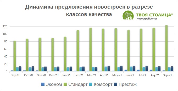 Значительный прирост новостроек наблюдается только в классе «Стандарт», объемы предложения во всех остальных классах качества существенно не меняются.