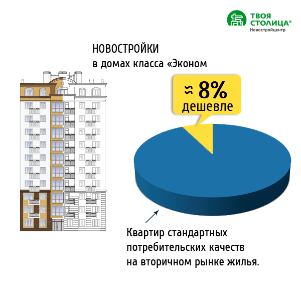 По данным отдела «ТВОЯ СТОЛИЦА.НОВОСТРОЙЦЕНТР», новостройки в домах класса «Эконом» в среднем на 8% дешевле квартир стандартных потребительских качеств на вторичном рынке жилья.
