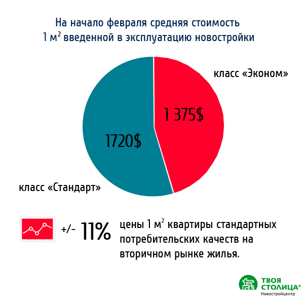 По данным отдела «ТВОЯ СТОЛИЦА.НОВОСТРОЙЦЕНТР», на начало февраля средняя стоимость 1 квадратного метра введенной в эксплуатацию новостройки класса «Эконом» составляет 1 375$, класса «Стандарт» - 1720$, что соответственно на 11% ниже и на 11% выше цены 1 квадратного метра квартиры стандартных потребительских качеств на вторичном рынке жилья.
