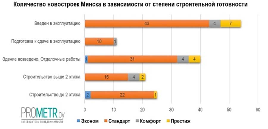 — Условно все новостройки Минска, в зависимости от их характеристик (материала стен, площадей квартир, технического оснащения, местоположения и прочего), можно разделить на 4 класса качества: «Эконом», «Стандарт», «Комфорт» и «Престиж». За неполный 2021 год количество новостроек, в которых квартиры доступны широкому кругу лиц (сюда не входят дома только для нуждающихся в улучшении жилищных условий), увеличилось более чем на 30% — со 115 до 151 дома. Это максимум для первичного рынка Минска. Для сравнения: десять лет назад их было 83, а пять лет назад — 99.