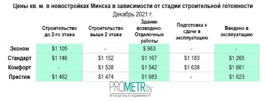 В зависимости от строительной готовности дома (строительство первых этажей и уже введенный в эксплуатацию) цены отличаются на сумму в среднем от $ 110 до $ 450 за кв. м. Разница увеличивается вместе с ростом класса качества дома. Однако по конкретным домам, в зависимости от структуры предлагающихся квартир (размер площади) и устанавливаемой застройщиками ценовой политики (акционные предложения и т.п.), данная закономерность может не наблюдаться.
